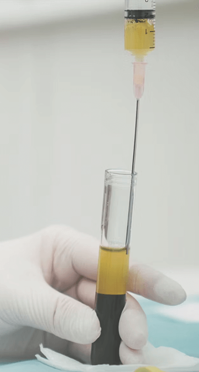 患者様ご自身から採血した血液を遠心分離し、血清成分のみを取り出し、さらにこの血清成分を遠心分離機にかけPRP(多血小板血漿)を作成します。そこへb-FGF(線維芽細胞増殖因子:薬剤名フィブラスト)を適正な微量添加します。このように作成したPRPF®を皮下に注射します。