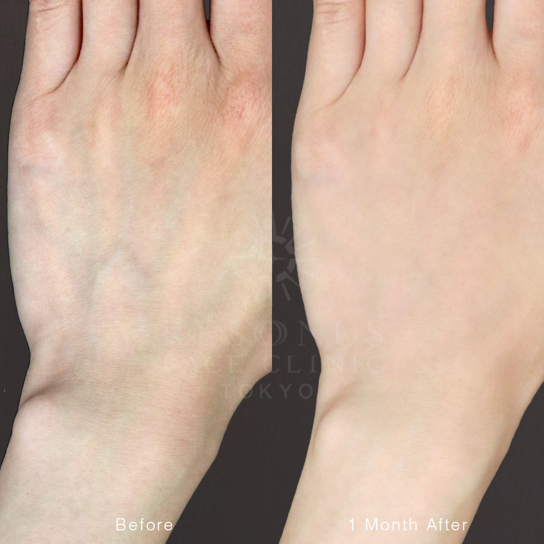 こちらのモニター様は、手の甲の血管が浮き出て目立つことにお悩みでした。 手の血管浮き(ハンドベイン)の治療として、血管を閉じてなくしてしまう治療法も存在しますが、正常な血管を潰してしまうことには弊害やデメリットが伴います。また、血管を消すだけでは、痩せてしまった手の組織をふっくらさせることはできません。