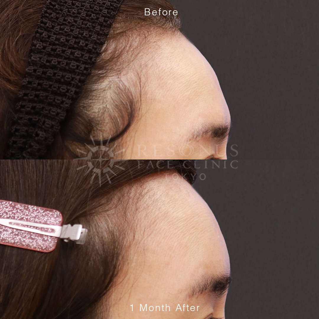 注入から1ヶ月後の様子です。 眉上のゴツゴツとした骨感が解消され、もともとの骨格を活かした自然なピーク(高さ)が形成されました。 女性らしい、丸く可愛いおでこに仕上がっています。
